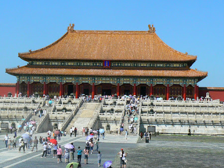 If China has a strong center – Beijing, Beijing also has a central point out of which everything radiates – it’s the Forbidden City. The old complex of imperial Palaces, named as it is because it was forbidden to the ordinary men, occupies a gigantic area – the emperors of China built this complex for 500 years using huge resources – that’s why the effort put in by tourists is equally big. You’ll need a guide – you can find an English speaking guide that will lead you among the hundreds of pavilions, corridors and squares, or one can get an audio-guide that’s guided through an ultra-modern system, the guide starting to talk exactly in that moment when you arrive in front of a certain monument. And for the surprise to be really big, this audio-guide talks lots of languages including Romanian, Bulgarian, Serbian or Tamil. You’ll travel for hours among hordes of Chinese tourists (try to avoid weekends!) wondering at the sight of the vast architectonic complex. Maybe you’ll be surprised by the austerity of the exhibits, you won’t find many object that furnish the buildings… all the imperial thesaurus was transported in Taiwan by the national army of Chiang Kai-Shek and can be visited in the National Museum in Taipei. Evacuated for the first time in 1931 when the Japanese attacked and occupied Manchuria, the huge thesaurus was transported all across China for 17 years, on the railways, by truck, by bullock cart, by boat or by foot, always some steps ahead of the Japanese and afterwards of Mao’s troupes. In 1948 the thesaurus eventually reached Taiwan and it became noticeable that in 17 years of wanderings not one vase was broken, not one spoon was stolen!